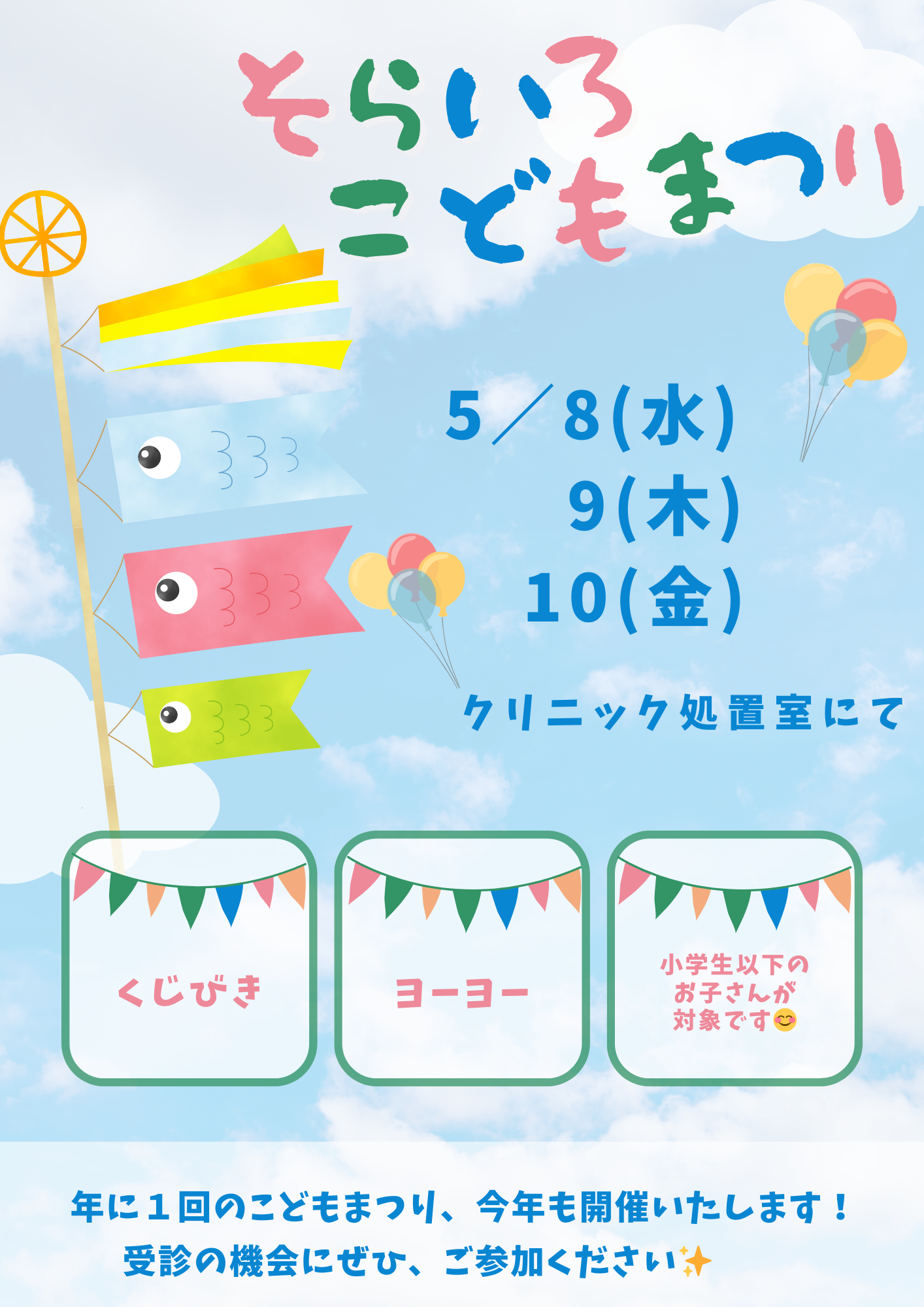 開院以来、毎年5月と9月に開催している「そらいろこどもまつり」を今年も行います。