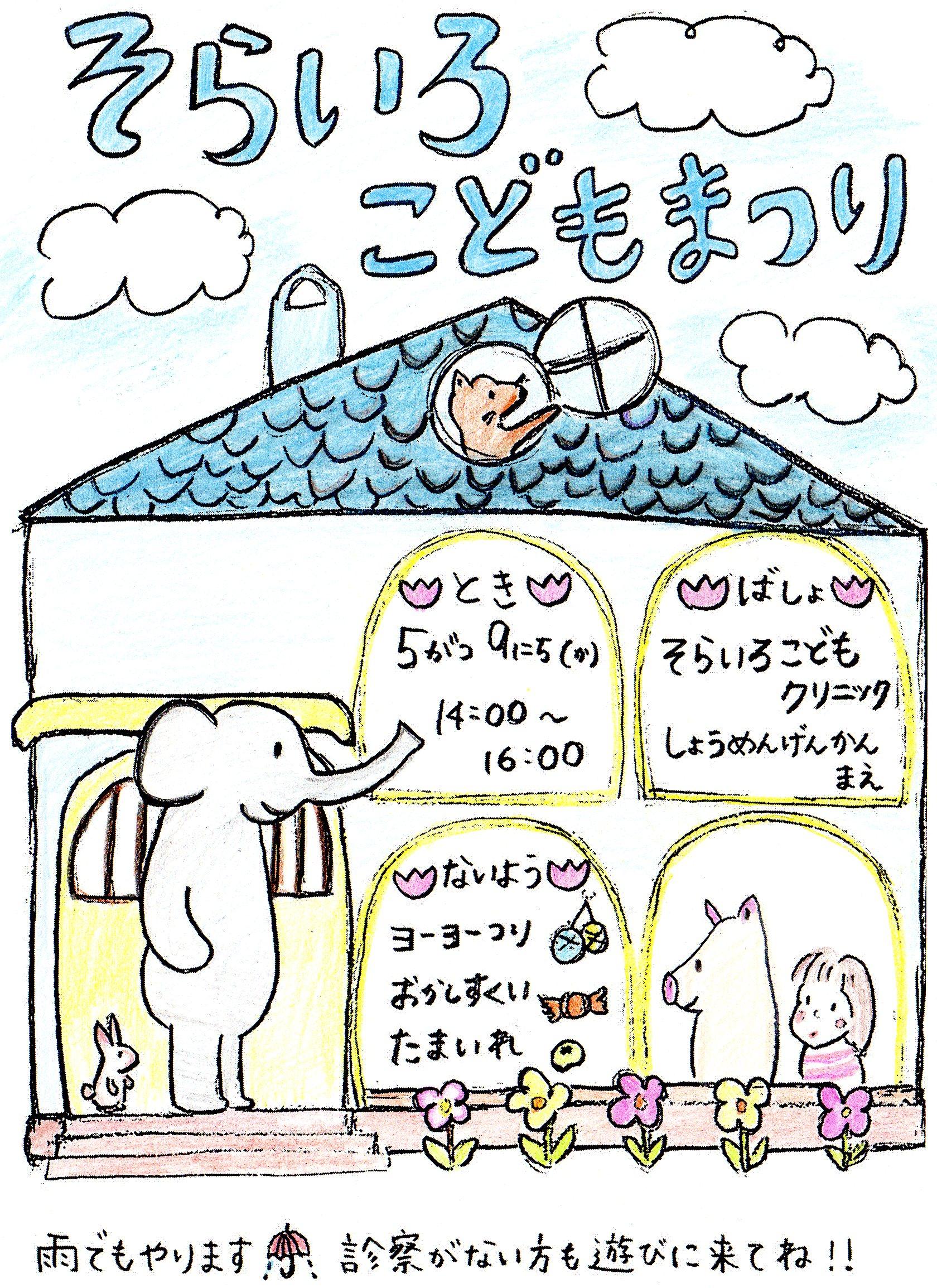 なんだか、すきっと春にならないですね~~ クリニックでも、まだ暖房が切れません。 さて、来たる5月9日火曜日に、第7回★そらいろこどもまつり★を行います。 開院当初から、5月(こどもの日前後)と9月4日(開院日)の年2回開催してきました。 いつも、お世話になっているご家族の皆様と大好きな子ども達のためのおまつりです。 こどもの日のイベントですが、スタッフも楽しみます。 前日までに、時々爆発させながらヨーヨーを100個ほどふくらまし、お子さん達の喜ぶ顔を思い浮かべながら、折り紙でこいのぼりをおったりします。 下はスタッフ作成の手作りポスターです。 外で行いますので、診察のない方も是非お越しください。 雨でも、テント内かクリニック内で行います。 今年も乞うご期待ください!! ![]() |